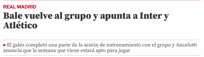 《世体》表示,贝尔预计会在下周皇马对阵国米或皇马对阵马竞的比赛中复出。此外,奥运会上受伤的塞瓦略斯也将在下周归队。