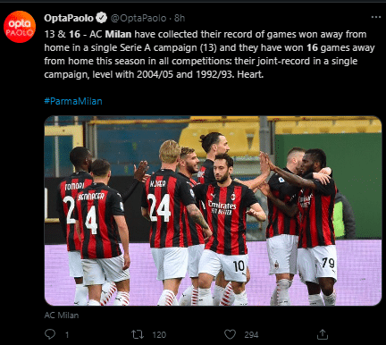 925直播讯北京时间4月11日,意甲第30轮,米兰客场3-1战胜帕尔马。据Opta统计,米兰本赛季已经16次在客场拿下胜利,其中13次都是在意甲联赛中取得。