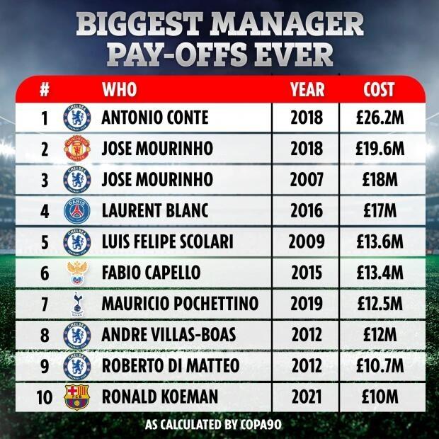 来源:JRS直播10-29 11:43925直播10月29日讯 《太阳报》日前统计了足坛解约金最高的主教练,孔蒂在离开切尔西时拿到2620万英镑排名第一,穆里尼奥则占据第二和第三位。