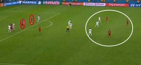 就地围抢,不多说了,很多人看球都能感受出来,中后卫大多是个子高大的那种,丢球以后,在对方中后卫拿球的时候上去围抢,让他们无法从容的转身处理球,要么被反抢成功,要么就大脚处理掉皮球,这也是tiki taka的防守精髓。
