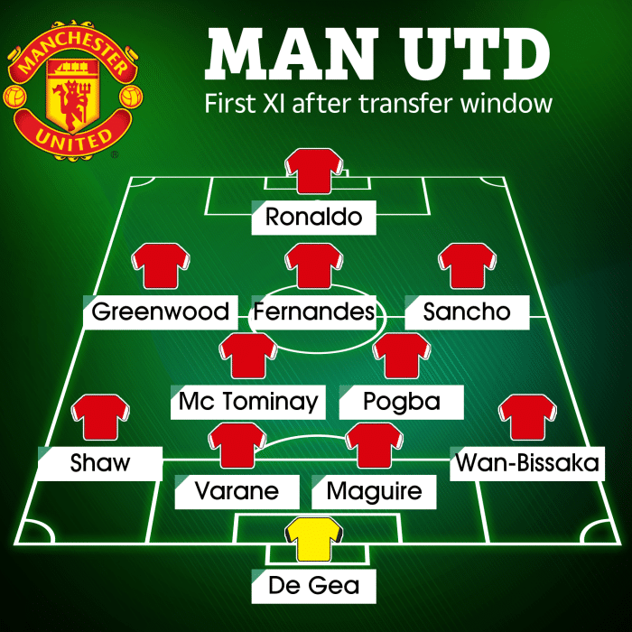 曼联主力阵容:德赫亚/万比萨卡,瓦拉内,马奎尔,卢克·肖/博格巴,麦克托米内/桑乔,布鲁诺·费尔南德斯,梅森·格林伍德/C罗;