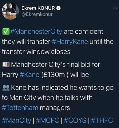 该记者表示,曼城给凯恩的最终报价为1.3亿英镑,他们有信心这个价格可以打动热刺,并在这个转会窗口关闭前签下凯恩。