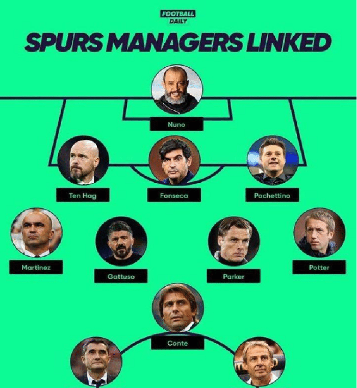 如图,英格兰媒体盘点了热刺绯闻主帅最佳阵容,门将位置上是努诺,这个可是跟随波尔图拿到欧冠的门将,后防线上分别是滕哈格、丰塞卡和波切蒂诺,其中滕哈格入选过荷兰国家队,丰塞卡球员时代差点,而波切蒂诺曾经是阿根廷国家队的主力。中场方面,分别是马丁内斯、加图索、帕克和波特,马丁内斯球员时代也是英超名将,加图索是米兰的核心,帕克和波特虽然名气不大,但是也都是各自球队的领袖。而前腰位置上是孔蒂,前场位置上是巴尔韦德和克林斯曼,这个前场三叉戟绝对非常豪华。而且,这还不算,替补阵容还有弗里克、纳格尔斯曼等人。