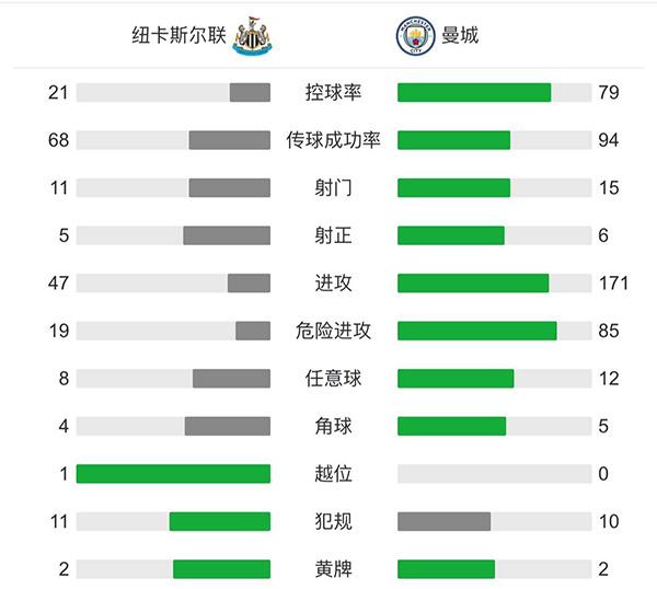 全场比赛结束,曼城客场4-3战胜纽卡斯尔联。