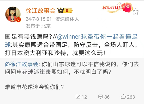 而当有球迷表示,崔康熙的防守反击、全场人盯人非常适合中国国足,打日本澳大利亚沙特就该这样玩,甚至有球迷推荐崔康熙应该去中国国足任教。的确,在伊万科维奇上任之前,崔康熙也一度被传出是中国国足主教练的热门人选,而在面对球迷的呼吁的时候,徐江更是直言:“国足有黑钱赚吗?”显然徐江的话语已经说的非常明白了,他的言下之意是此前崔康熙没有参与到国足主教练的竞聘,主要的原因是俱乐部有外快可以赚,可以通过引援赚钱,而在中国国足这是不可能发生的,特别是在李铁的事情发生之后。徐江的爆料,也是让崔康熙成为了众矢之的,接下来,我们也看看崔康熙这边会如何的去回应徐江了。
